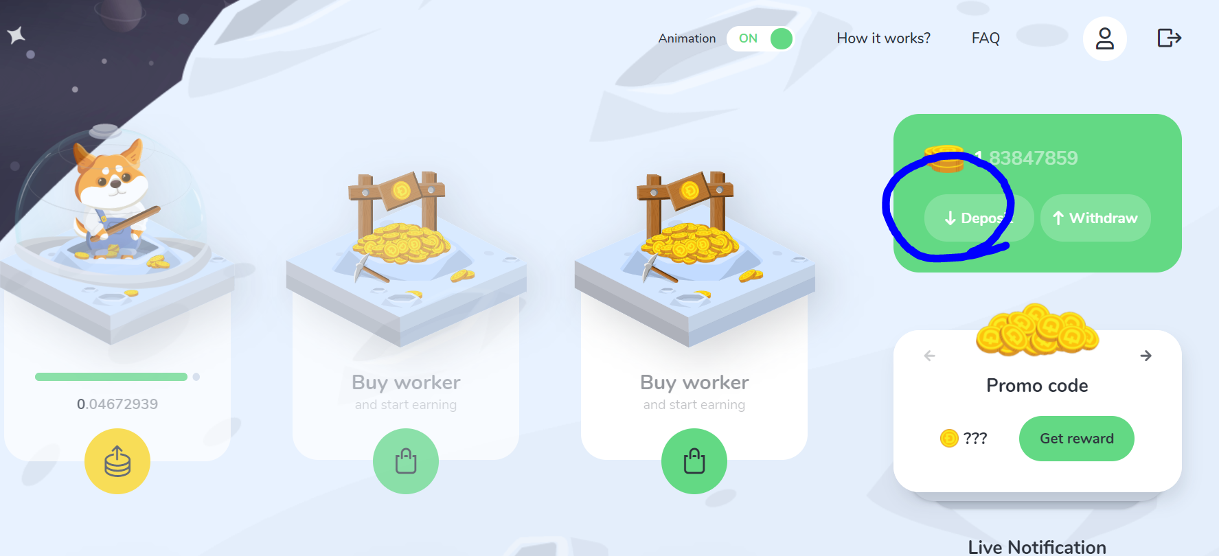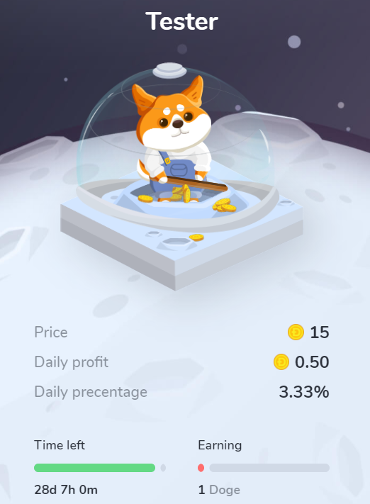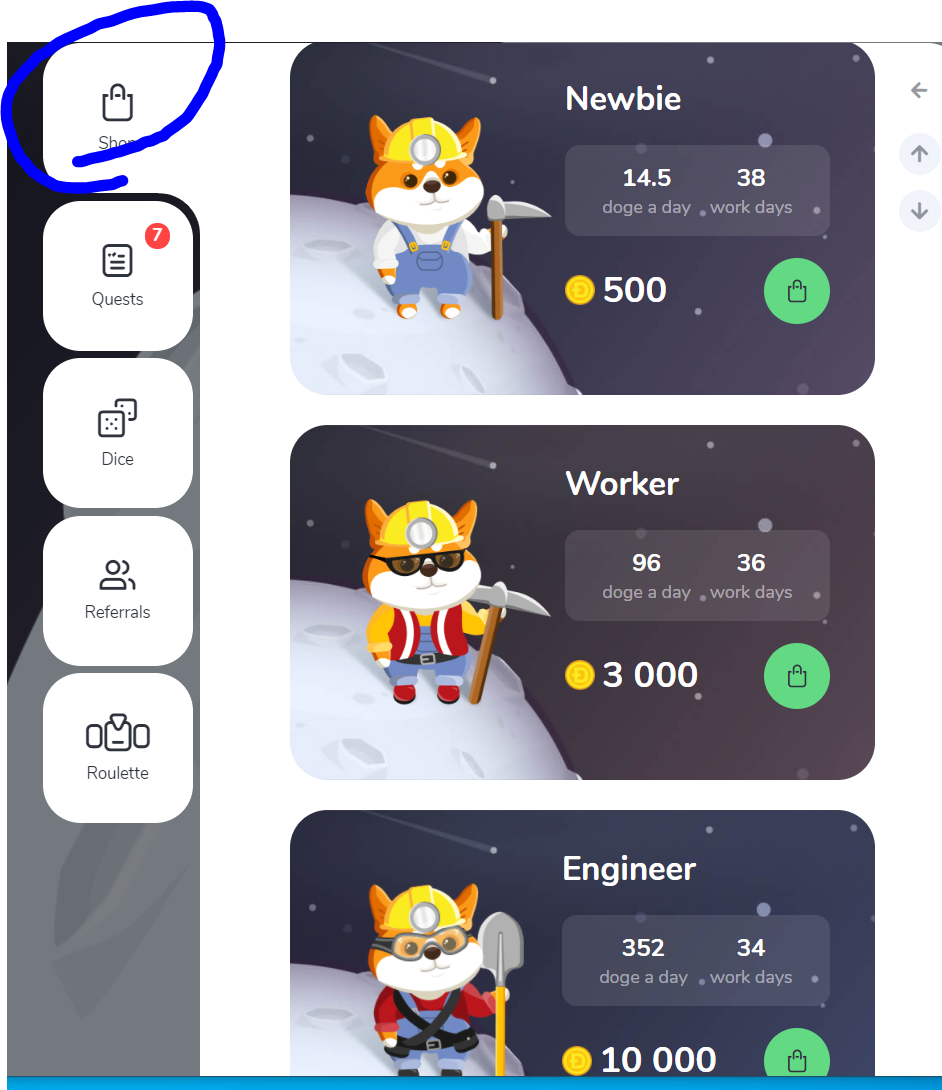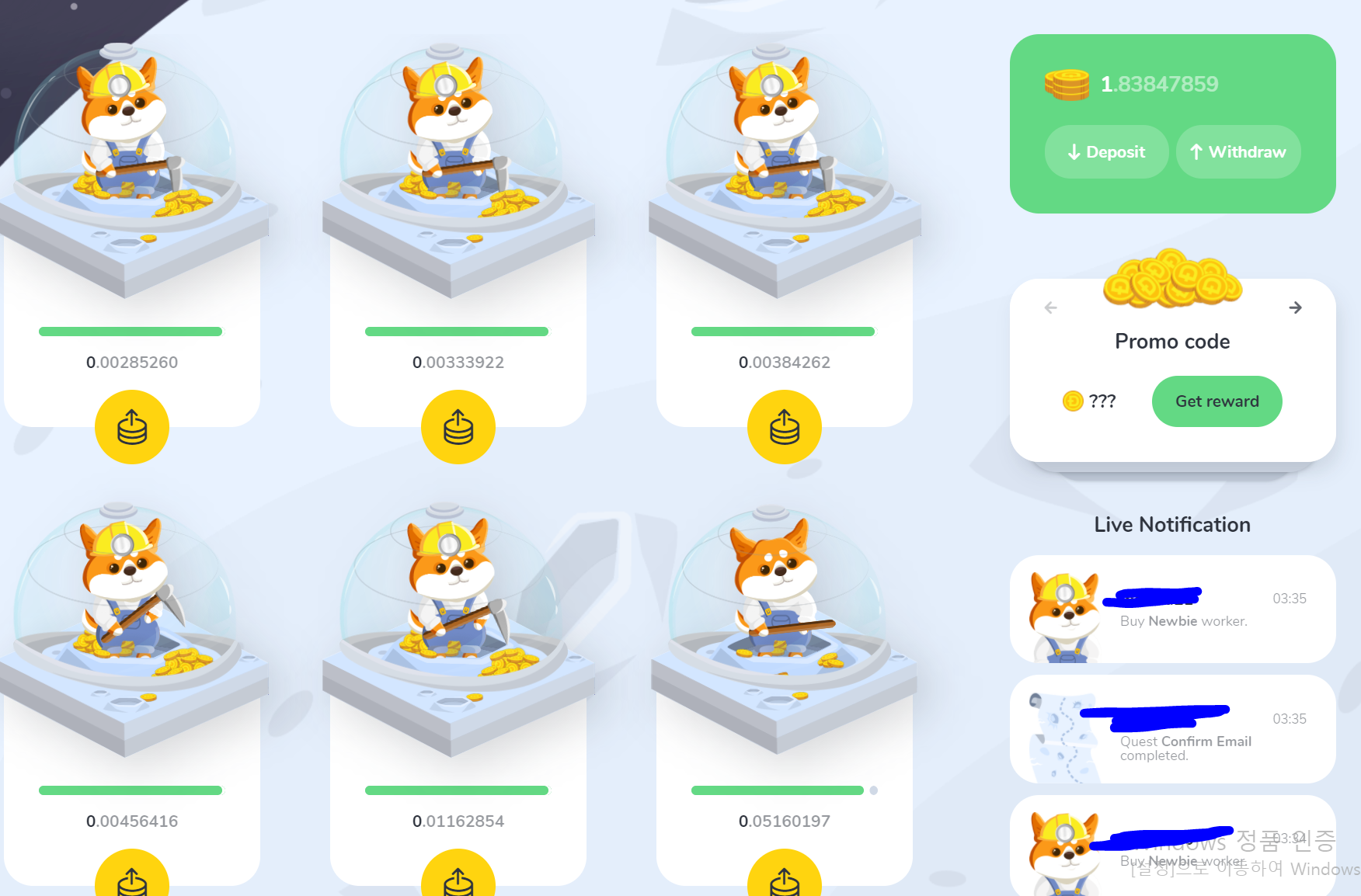 도지코인을 입금하여 shop에서 구매를 하여야 수익을 보실수 있습니다.
