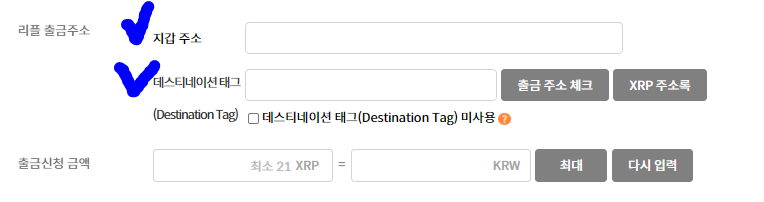 지갑주소와 데스티네이션태그 (매우중요)를 입력하신후 출금 할 XRP 갯수를 입력후