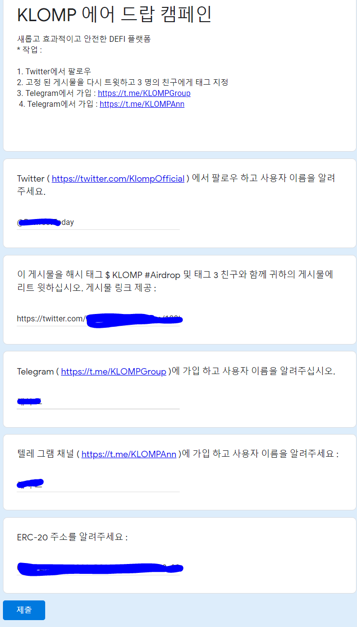 트위터주소,텔레그램 ID, 리트윗주소 입력하고 제출하시면 됩니다.