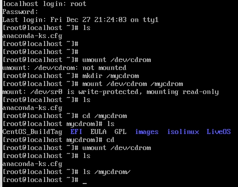 mount /dev/cdrom /mycdrom <!-- 연결 해당 생성한 폴더에 연결